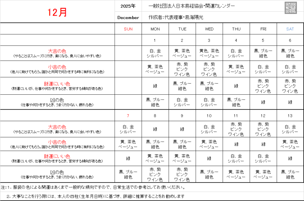 2025年12月揺鞭風水開運カレンダー